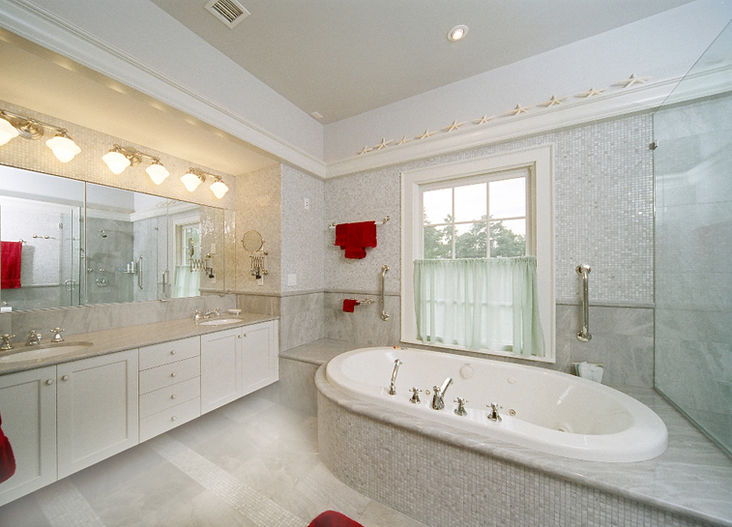 The "original" house was an old schoolhouse that had been moved to the site in the 1920s. An addition was made to each side and the back, but it was never really integrated. The result was an out-of-scale interior with a poorly organized entry and many tiny dark bedrooms. A large, sophisticated kitchen and connecting porch addition to the rear and a new entry, driveway, and exterior porch to the front solved the scale and proportion issues. Interior finishes were vastly upgraded, while daylight was evenly spread throughout the house to make this 'once upon a boarding house' look elegant and stately.